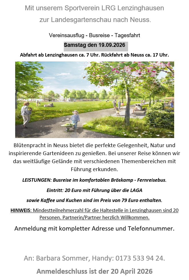 Mit der LRG zur Landesgartenschau nach Neuss. Samstag den 19.09.2026. Abfahrt ab Lenzinghausen ca. 7 Uhr. Rückfahrt ab Neuss ca. 17 Uhr.